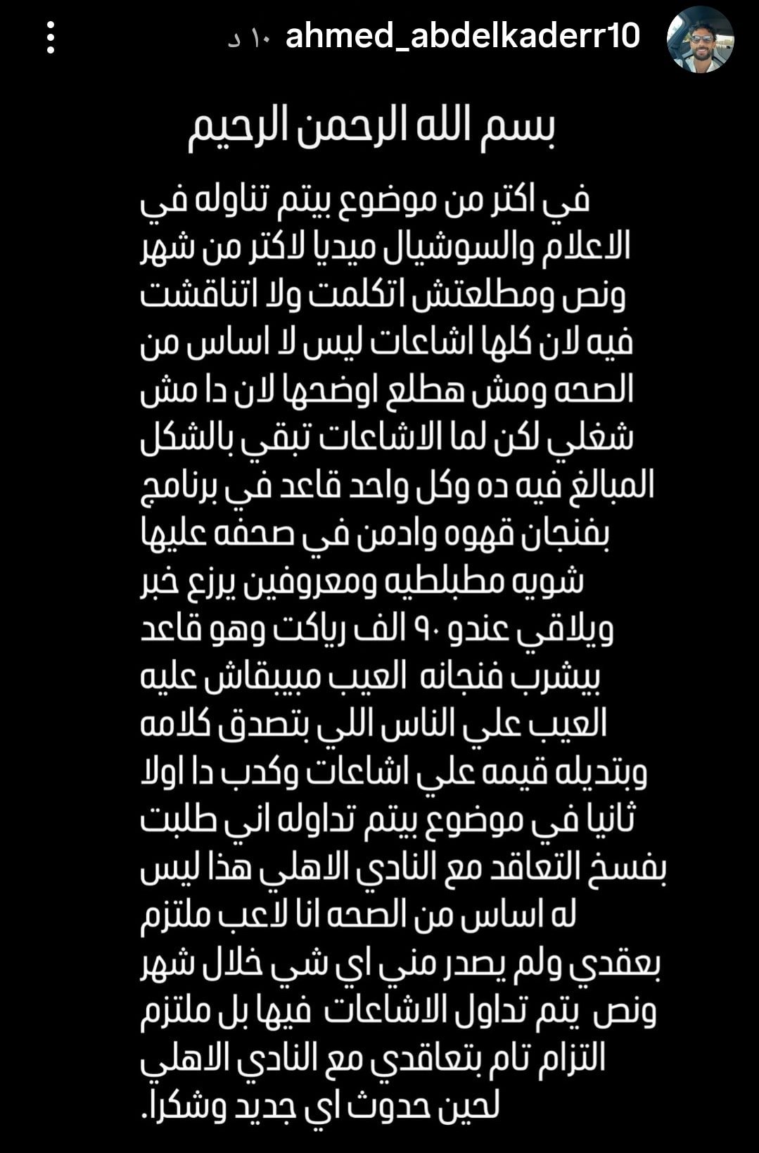 واختتم اللاعب بيانه بتوجيه الشكر لجماهير الأهلي، داعيًا الجميع إلى تحري الدقة وعدم الانسياق وراء الأخبار غير الموثوقة التي لا تستند إلى مصادر رسمية.