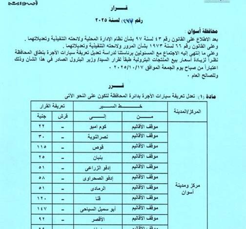باشرت محافظة أسوان صباح اليوم تطبيق التعريفة الجديدة للمواصلات الداخلية والخارجية، بما في ذلك سيارات السرفيس، والتاكسي، والتوك توك، ووسائل النقل الجماعي بين المراكز والمدن.
